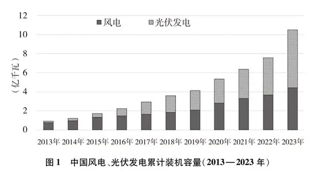 推动风电、光伏发电跃升发展。中国风能、太阳能资源丰富,风电、光伏发电成为清洁能源的主力军。有序推进大型风电光伏基地建设,以库布其、乌兰布和、腾格里、巴丹吉林沙漠为重点,规划建设4.5亿千瓦大型风电光伏基地项目。推进海上风电规模化集群化发展,累计装机规模达3728万千瓦。积极推进分布式新能源发展,开展“千乡万村驭风行动”“千家万户沐光行动”,推广农光互补、渔光互补、牧光互补等“光伏+农业”新模式,打开了农村新能源发展的广阔空间。截至2023年底,中国风电、光伏发电累计装机容量分别达4.41亿千瓦、6.09亿千瓦,合计较10年前增长了10倍。其中,分布式光伏发电累计装机容量超过2.5亿千瓦,占光伏发电总装机容量40%以上。