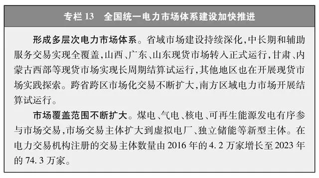 建设全国统一的能源市场。加快建设全国统一电力市场体系,省、区域、省间交易高效协同,中长期、现货、辅助服务交易有机衔接。组建电力交易中心、石油天然气交易中心和煤炭交易中心,搭建公开透明、功能完善的能源交易平台。全国市场化交易电量占全社会用电量比重由2016年的17%提高到2023年的61.4%,2023年风电光伏市场化交易电量占风电光伏总发电量的47%,有力促进了电力资源的优化配置和可再生能源的高效利用。