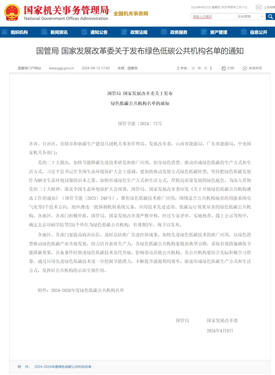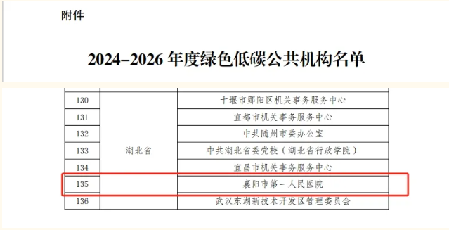 近日, 国管局、国家发展改革委发布 绿色低碳公共机构名单, 襄阳市第一人民医院 被评为“全国绿色低碳公共机构”。 全省医疗机构仅此一家获此殊荣。 这是医院继2023年 获得全国医院节能领跑示范单位后, 获得的第二个此类荣誉。